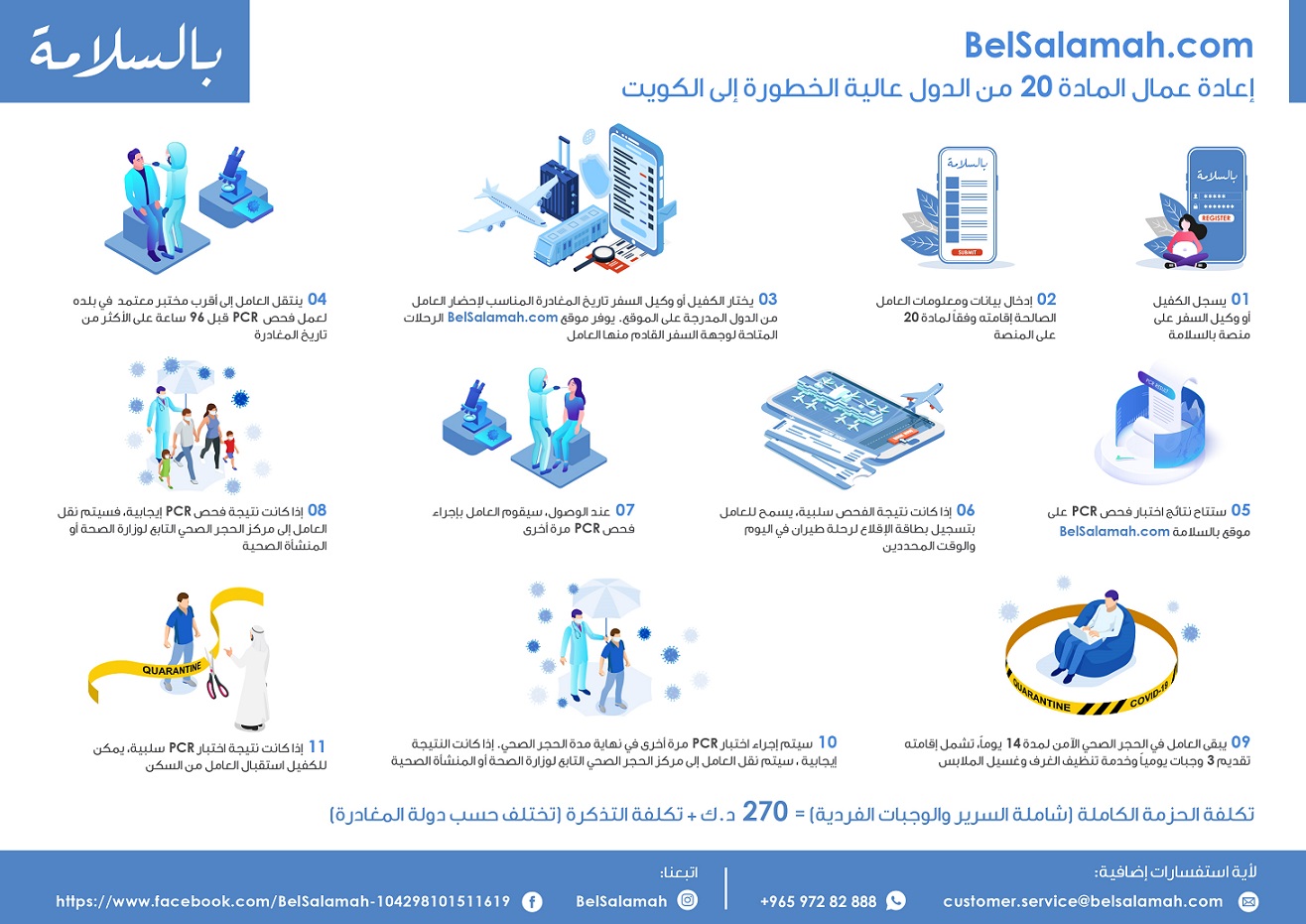 Belsalamah.com aims to help sponsors bring back their workers to Kuwait in a faster, smoother and safer manner. By ensuring the workers that board the flight are COVID-19 free, Besalamah.com helps protect the health of other passengers, airport staff and the Kuwaiti population. It also assists the fulfillment of COVID-19 travel requirements with reduced waiting time and disruption.